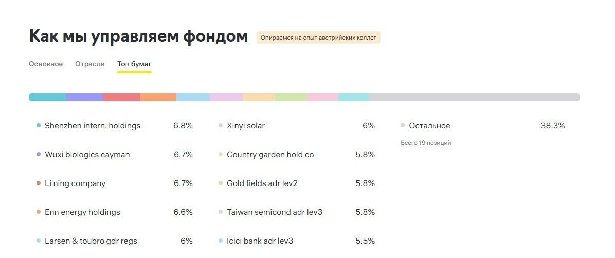 Важно смотреть не только на список активов фонда, но и на управляющую компанию. Для максимальной диверсификации рисков выбирайте фонды от разных УК — так даже если одна компания сделает фатальную ошибку, другие могут удержать инвестиционный портфель на плаву.
