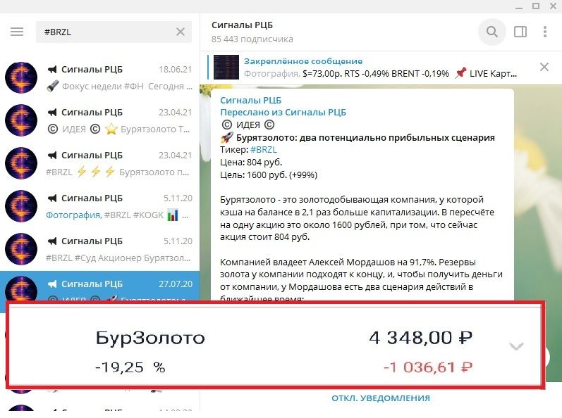 Пример: канал «Сигналы РЦБ» в Telegram рекомендовал акции компании «БурятЗолото», но пока они в минусе на 19,25%