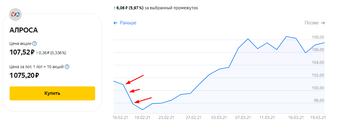 Покупайте, когда цена падает — например, в местах, отмеченных на графике